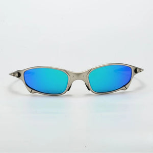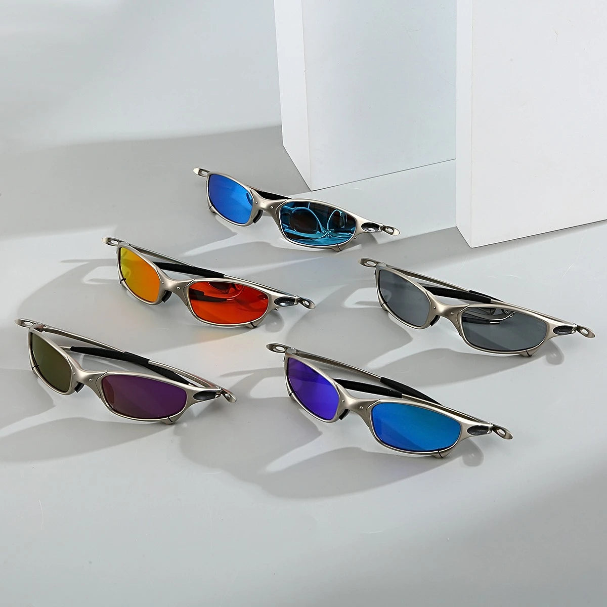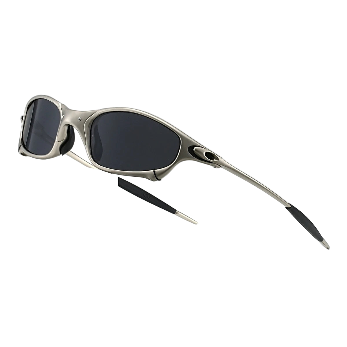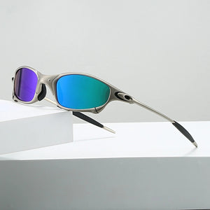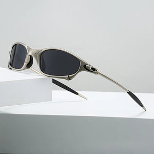 Futuristic wrap-around sunglasses with sleek metallic frames and dark lenses for a bold Y2K cyberpunk edge.