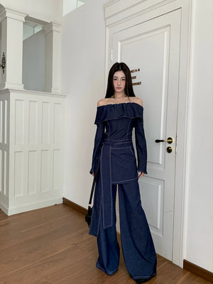 Style yourself in this ultra-chic off-the-shoulder denim set and rock this tailored, contrast-stitched silhouette for a powerful modern look.
