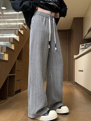 Relaxed Striped Wide-Leg Pants: Master the laid-back aesthetic with these ultra-comfortable, slouchy trousers featuring a classic textured vertical stripe and adjustable drawstring waist.