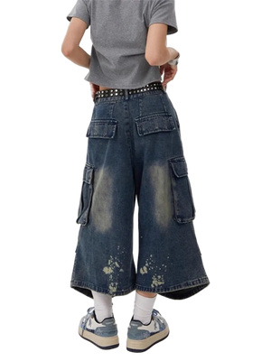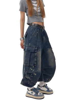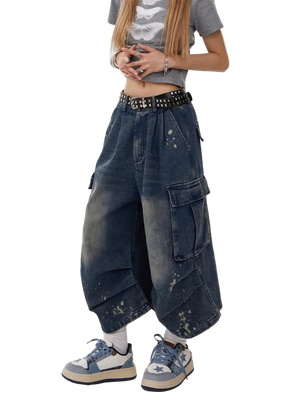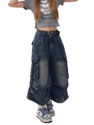 Rock these wide-leg denim cargos featuring edgy paint splatters and a vintage wash for the ultimate streetwear statement.