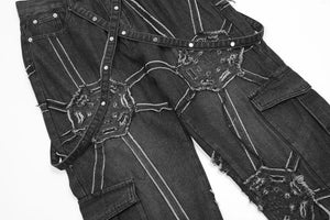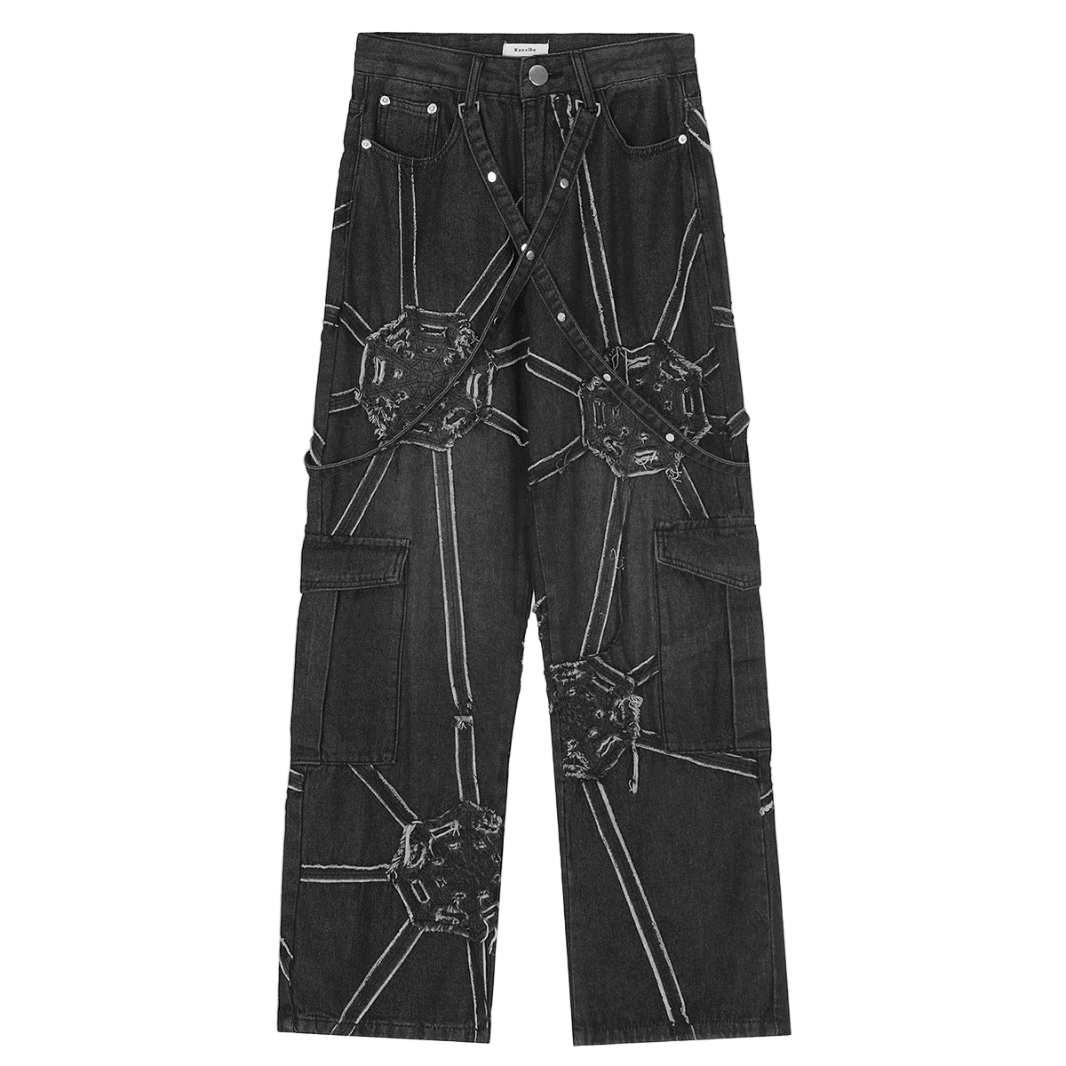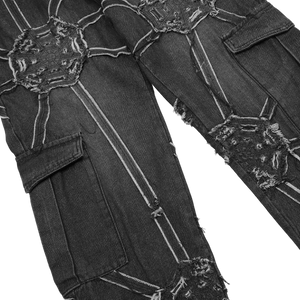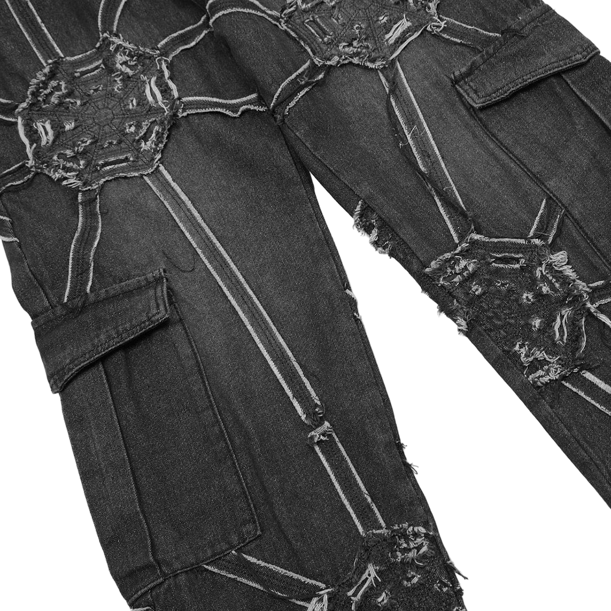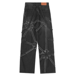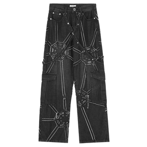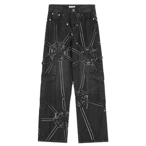 Upgrade your look with our cyber-web graphic cargo jeans. Featuring a relaxed fit and utility pockets for a bold techwear and Y2K aesthetic.