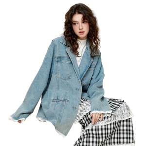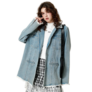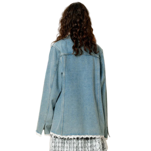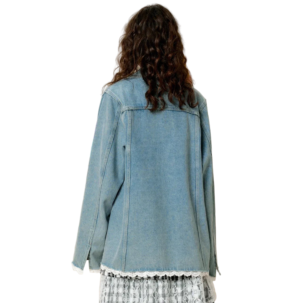 An oversized denim jacket featuring stylish trim patchwork detailing, giving it a bold, modern, and effortlessly cool streetwear look.