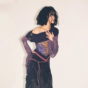 Edgy grunge Y2K-inspired off-shoulder top with knitted mesh design for a bold and stylish streetwear vibe.