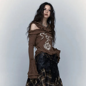 Edgy grunge Y2K-inspired off-shoulder knitted top with a bold, slouchy fit for a cool, rebellious streetwear vibe.