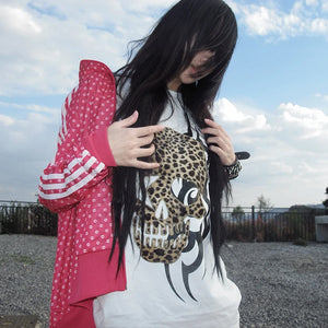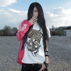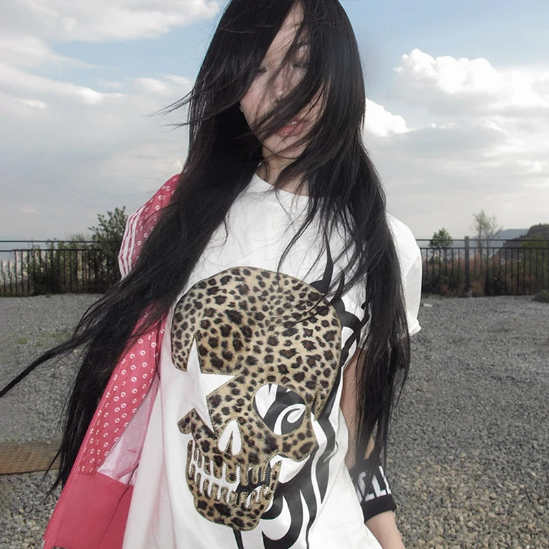 Edgy grunge Y2K-style women’s tee featuring a bold skull print for a dark, vintage streetwear look.