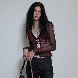 Grunge Y2K Tattoo Print Mesh Women's Top