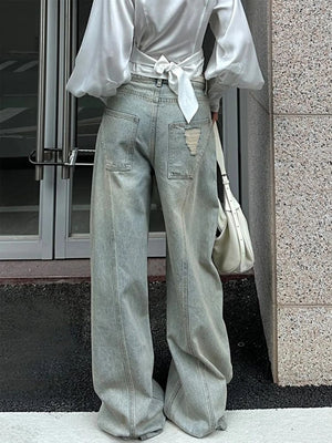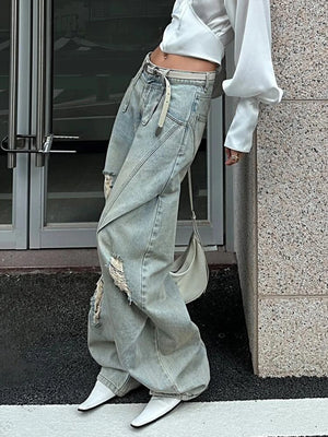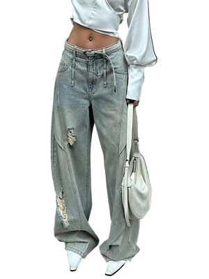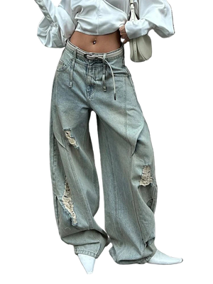 Baggy, ripped jeans with a distressed finish, high-waisted fit, and an oversized silhouette.