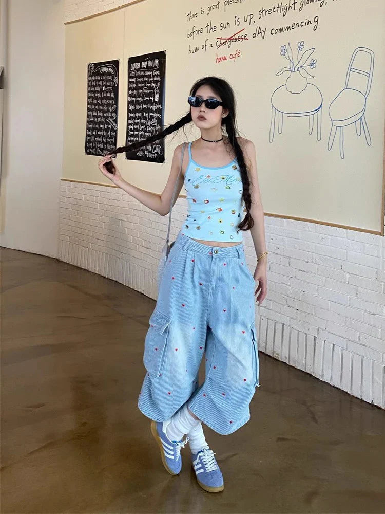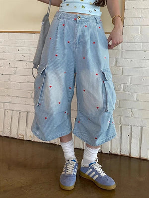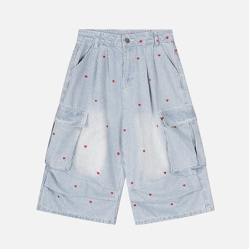 Chic Striped Heart Embroidery Cargo Denim Jorts