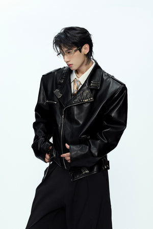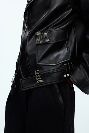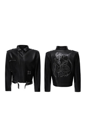 Pin Detail Geisha Print Leather Jacket