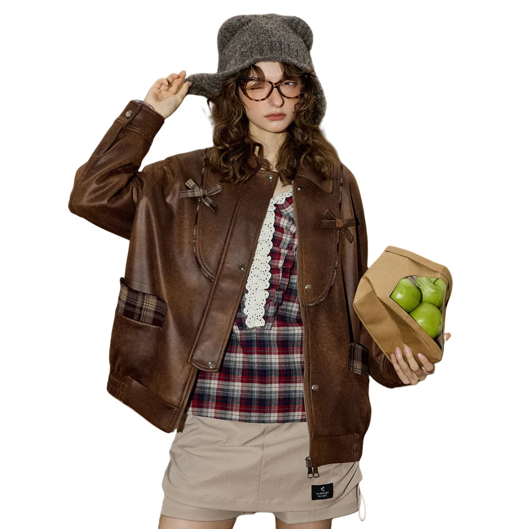 Retro Versatile Plaid Patchwork Leather Jacket