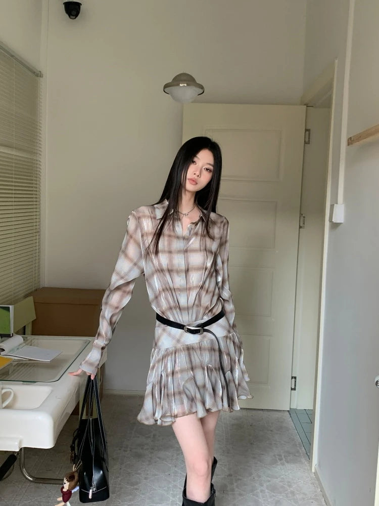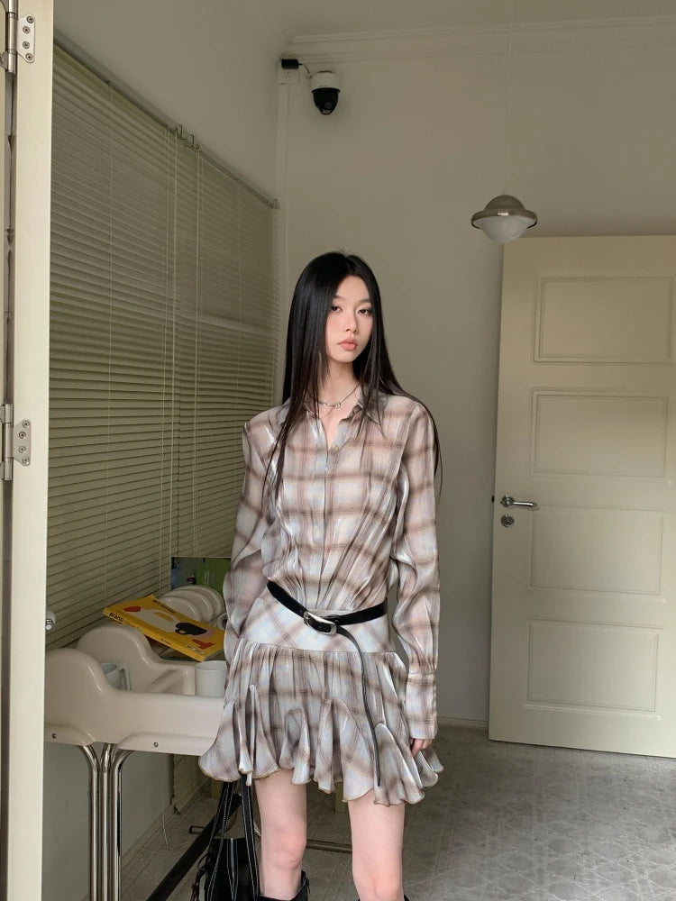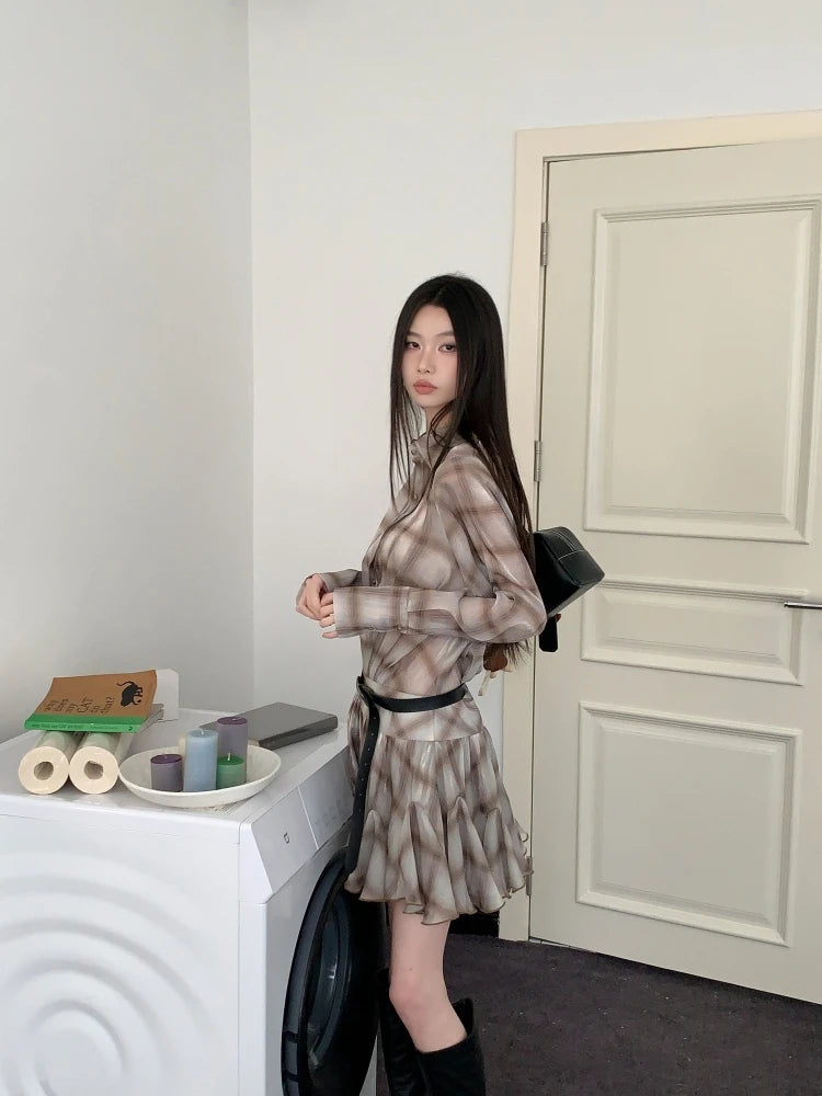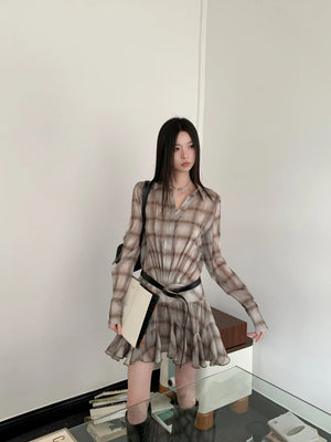 Step out in a trendy, effortless look with this long-sleeve plaid mini-dress.