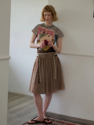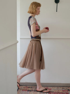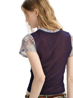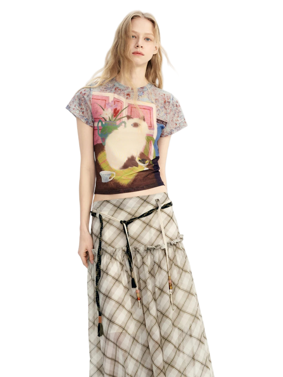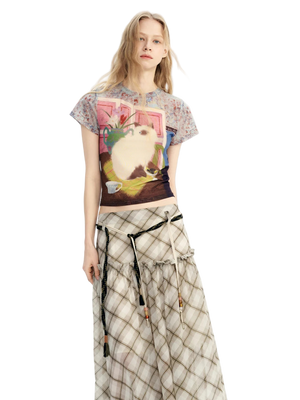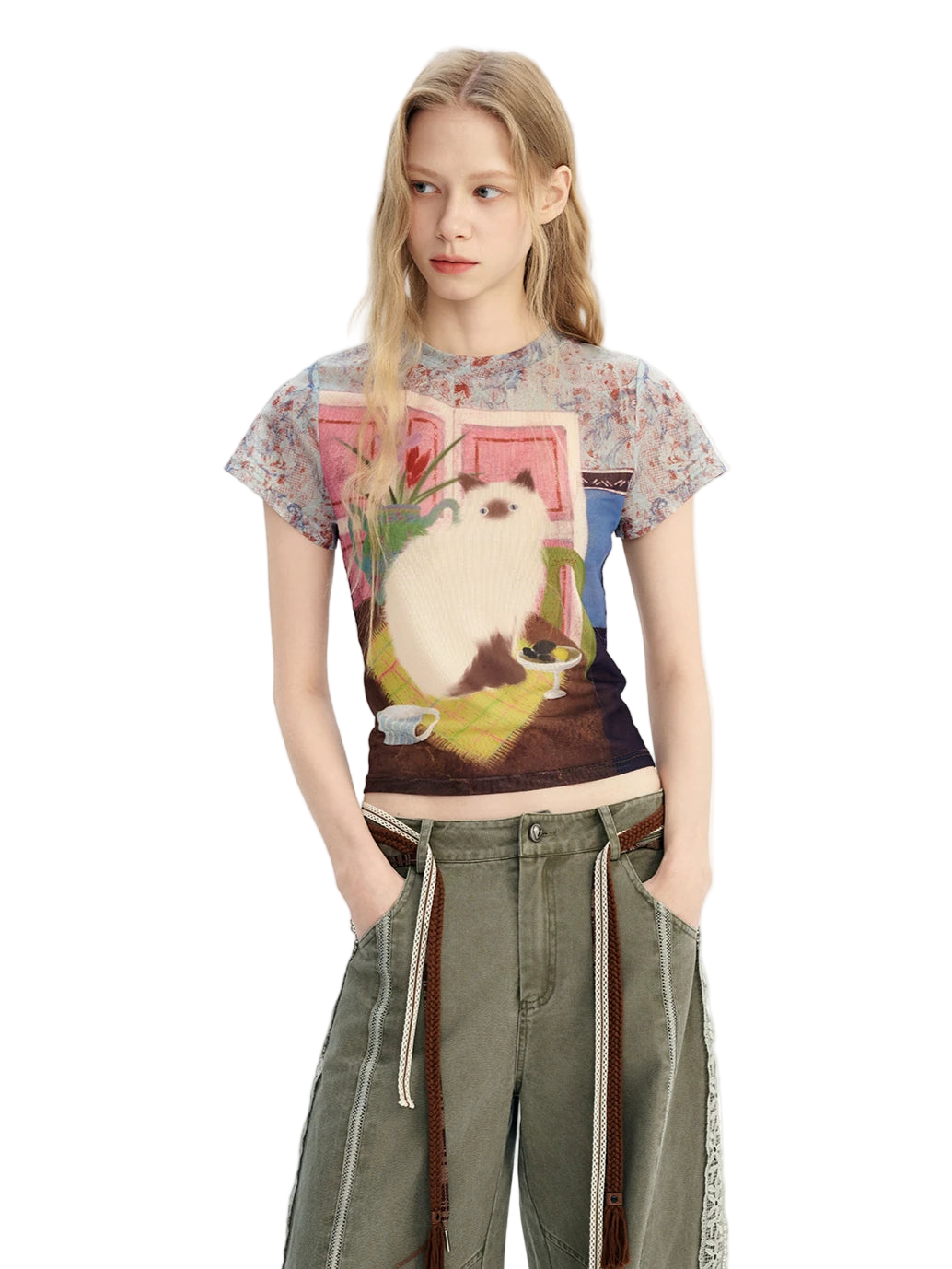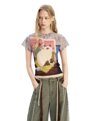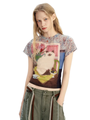 An artistic, fitted mesh top. Featuring a charming cat graphic and patterned sleeves, this soft baby tee is a unique statement piece.