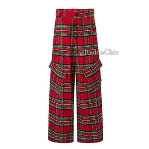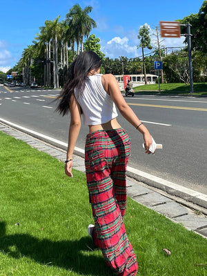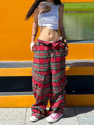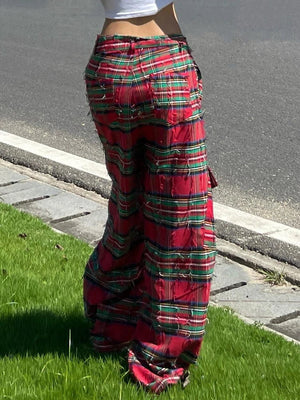 Durable Red Block Plaid Ripped Pants