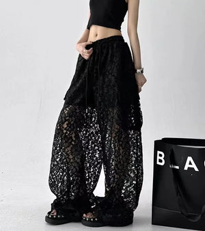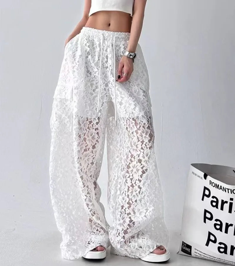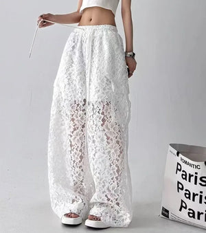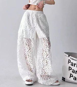 Women Solid Color Lace Hollow Wide Leg Pants