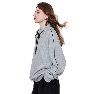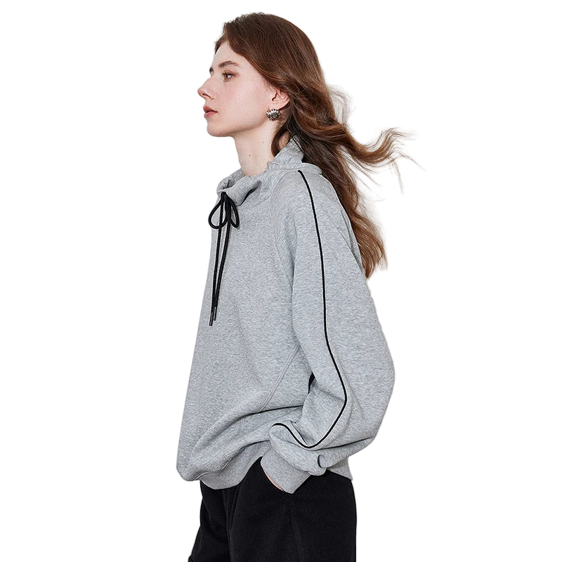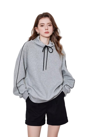 Elevate your comfort game with this oversized heather gray hoodie featuring striking black contrast piping and a drawstring neck.