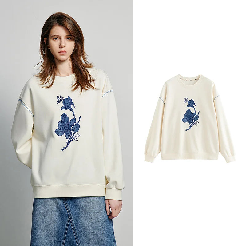 Elevate your casual wear with this creamy white crewneck sweatshirt featuring a striking blue embroidered floral design.
