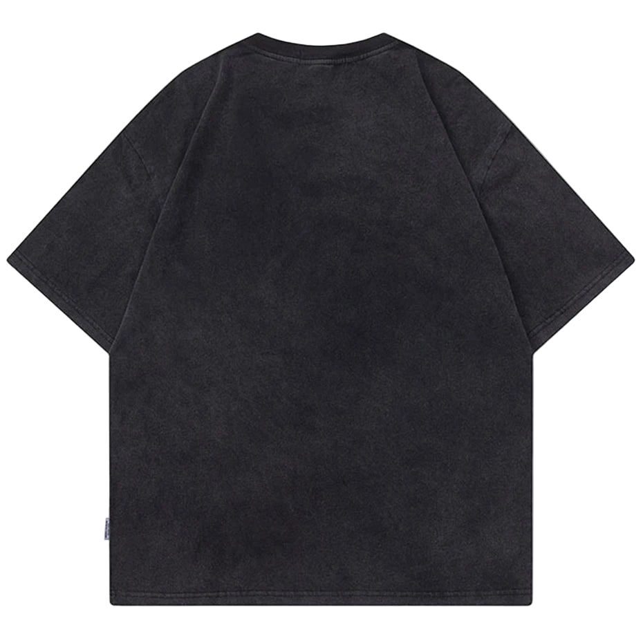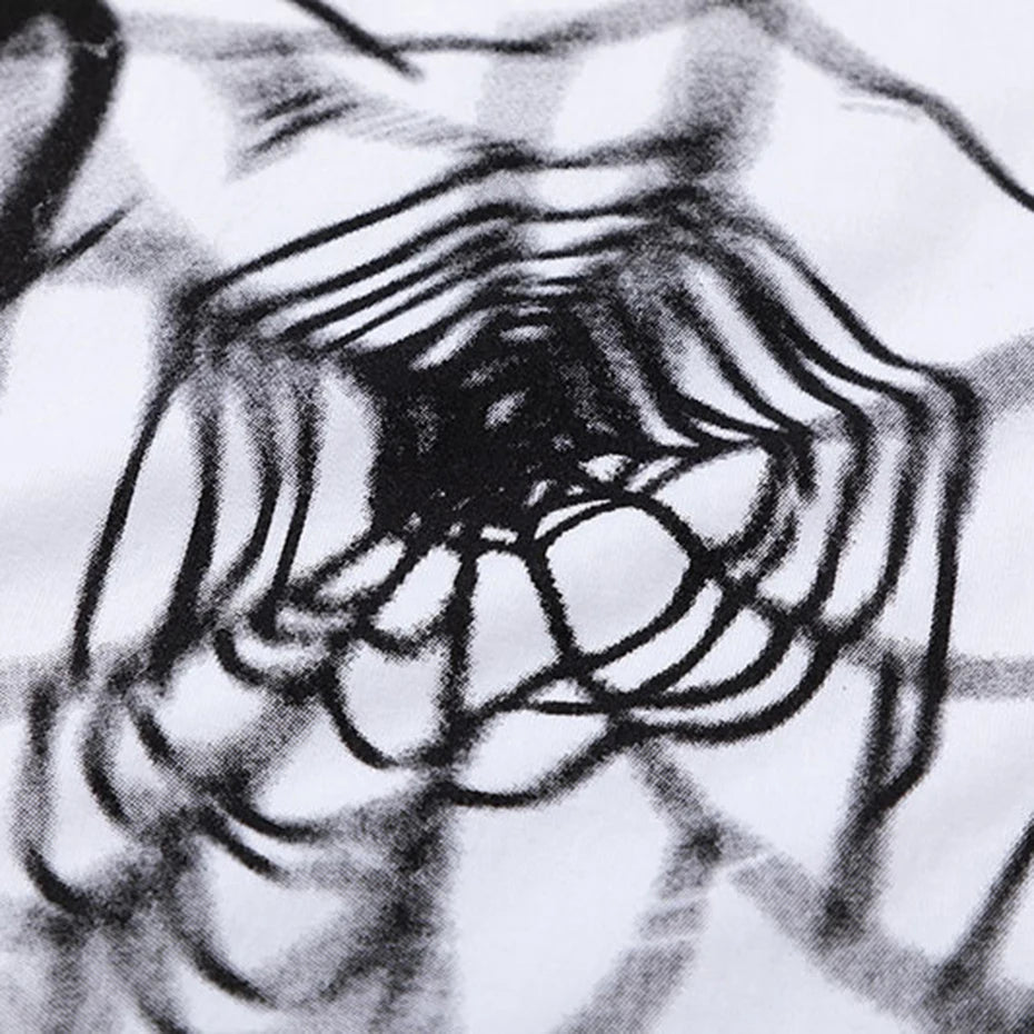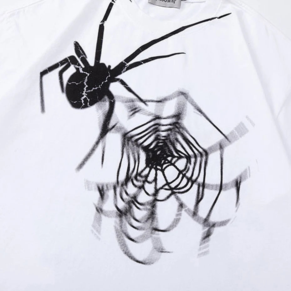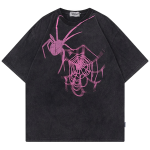 Pink Spider Graphic Tee — a washed black oversized shirt featuring a bold pink spider and web print for a striking gothic streetwear look.