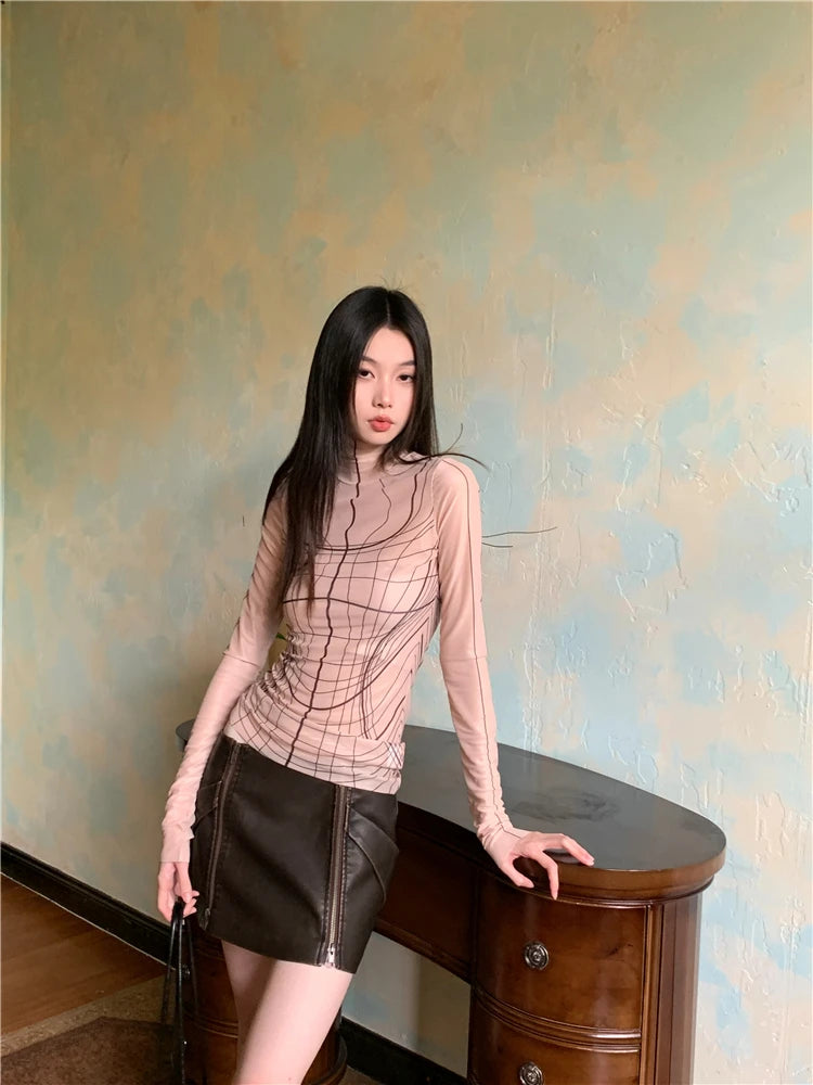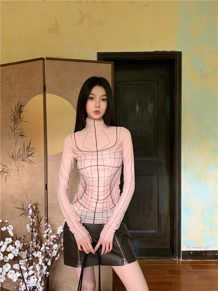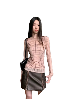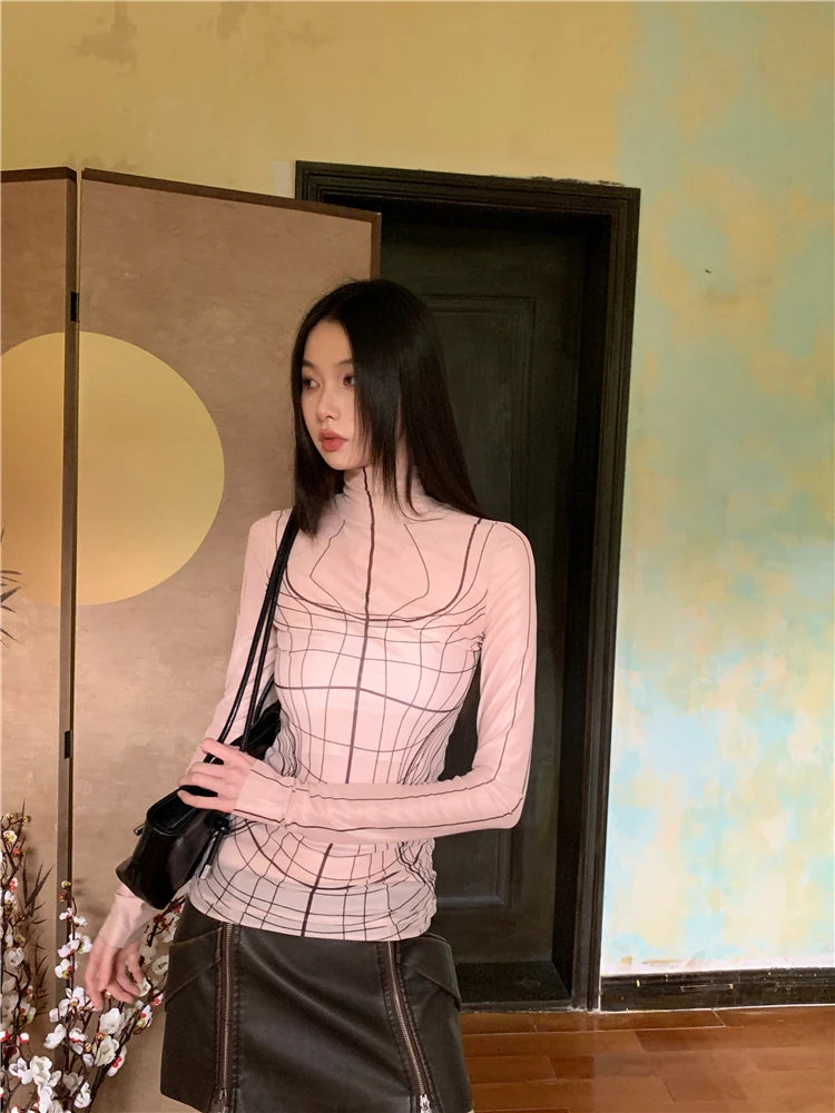 Elegant designer mesh turtleneck top with long sleeves for a sleek, modern layered look.