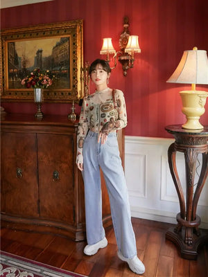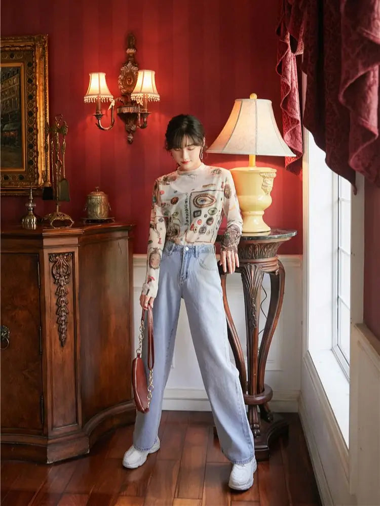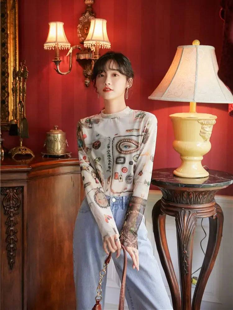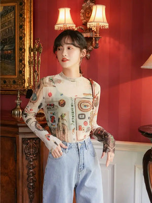 Style yourself in this unique abstract print sheer mesh top and rock this fitted, mock-neck layer for a bold, artistic everyday look.